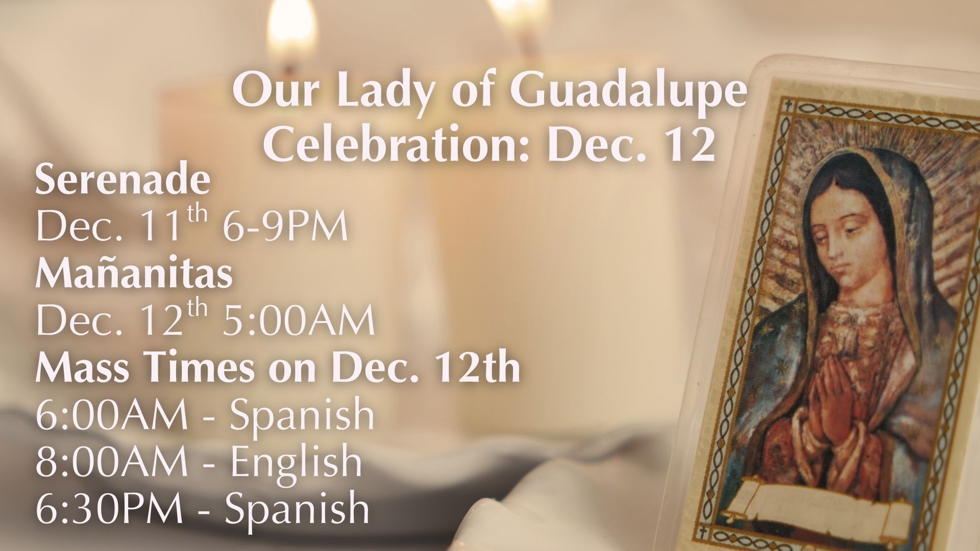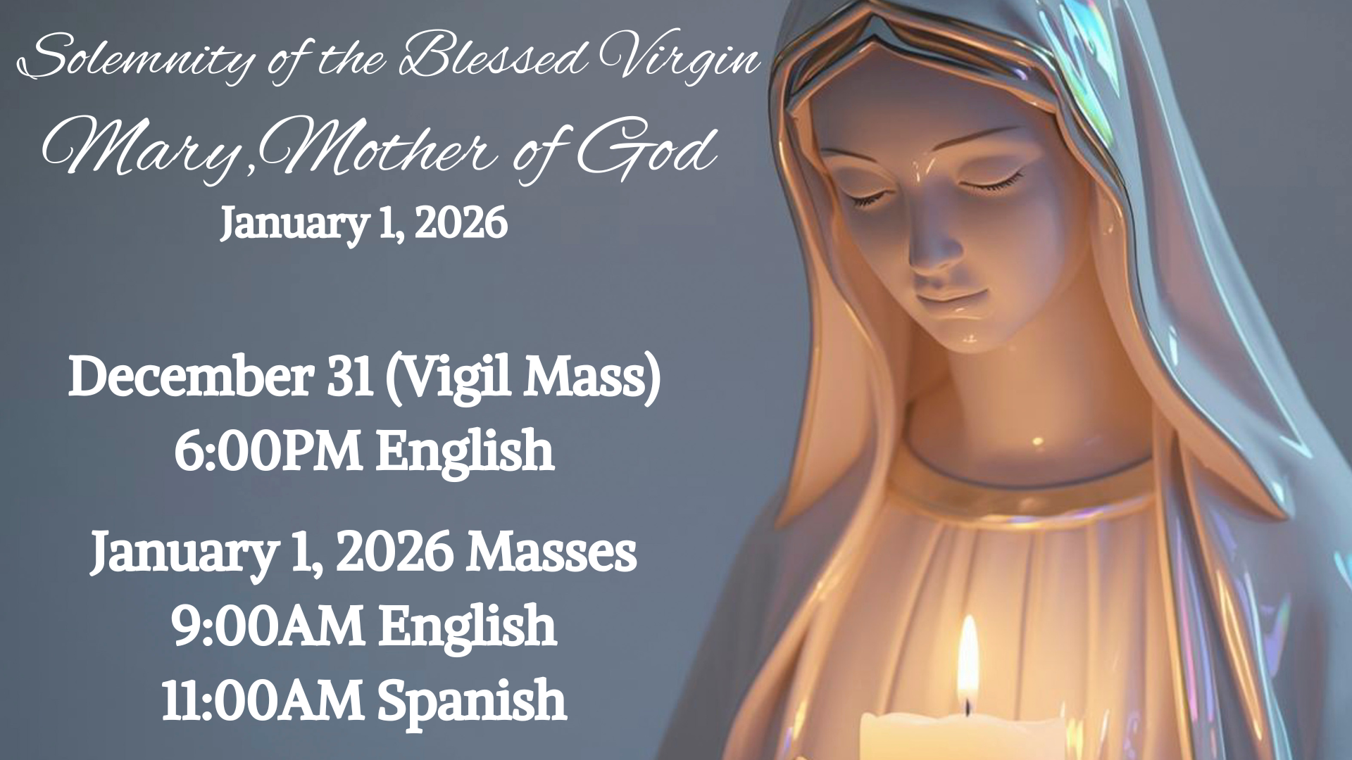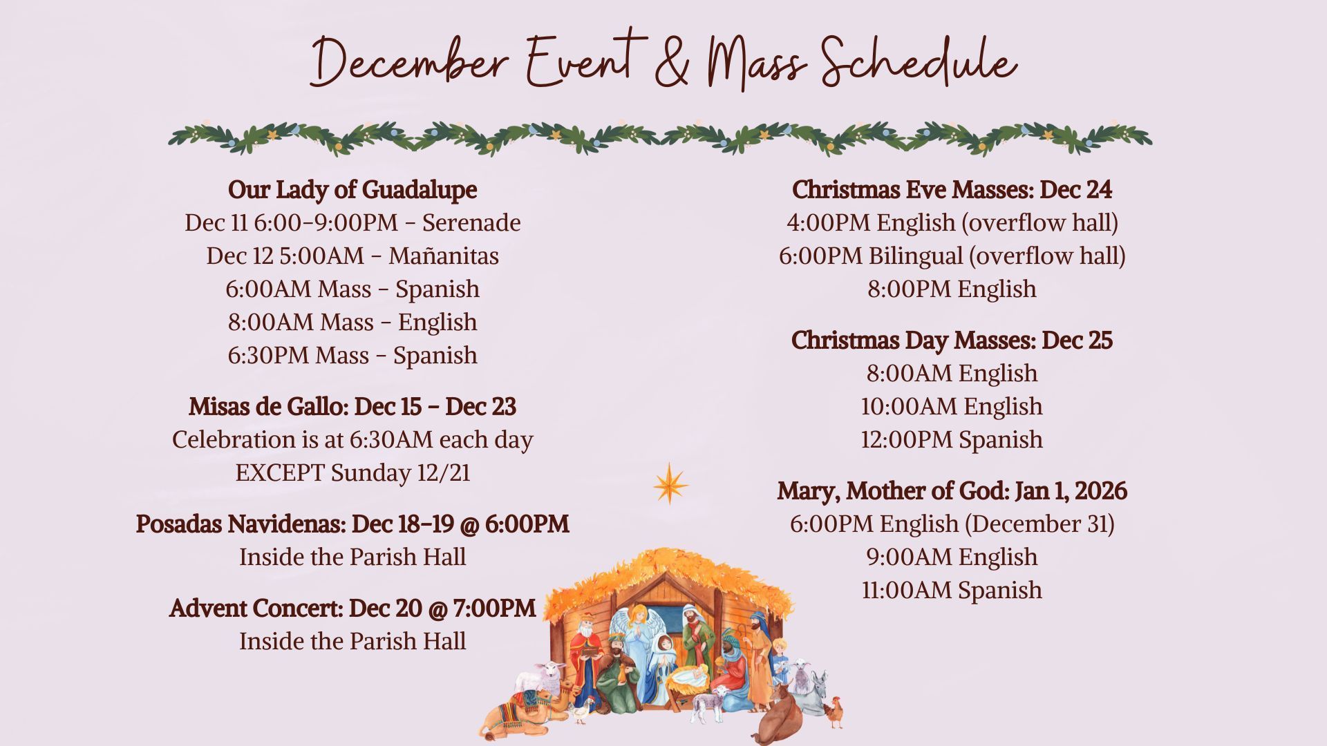 7:30AM (English), 9:00AM (English), 11:00AM (Spanish), 12:30PM (English)